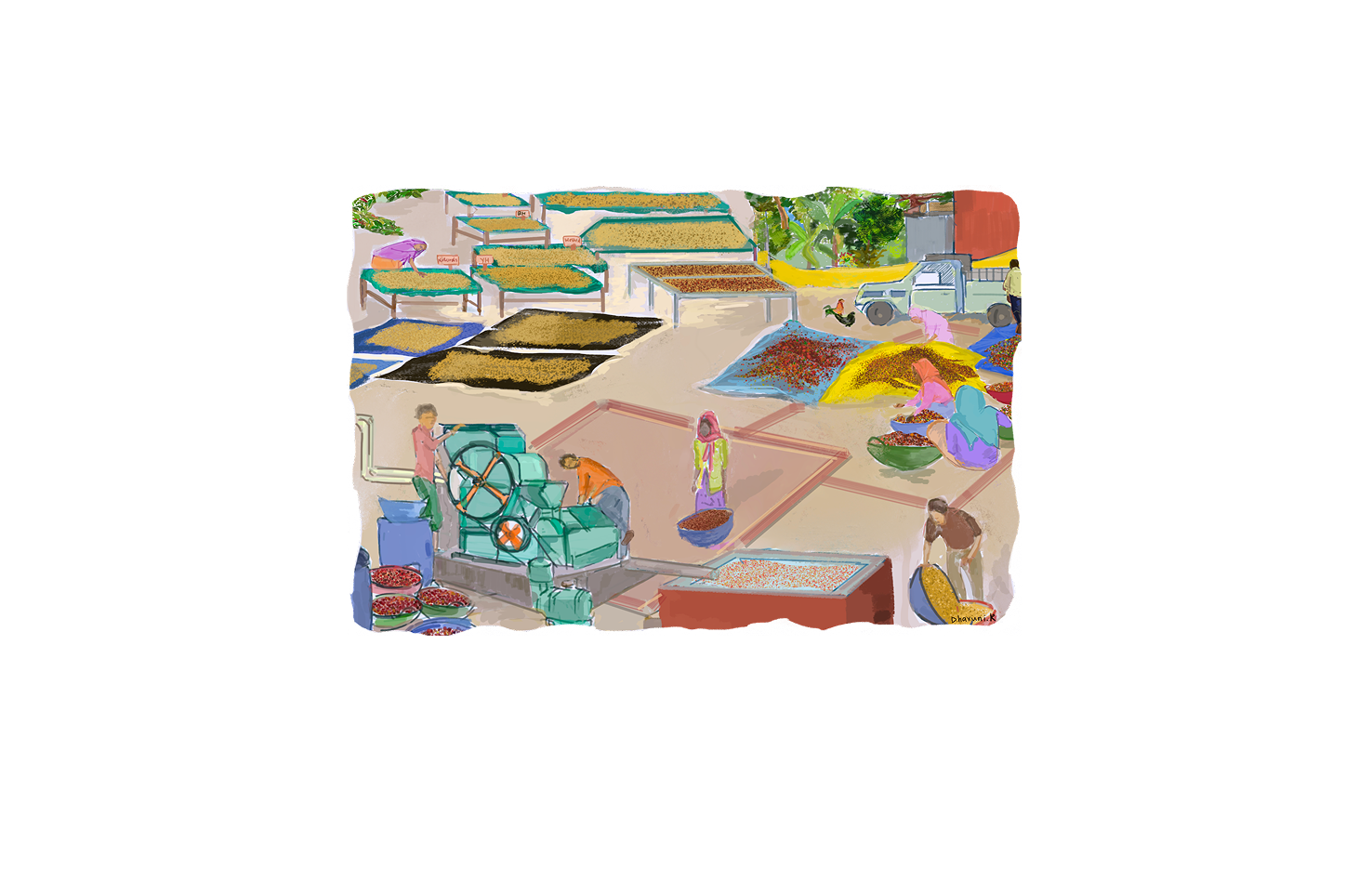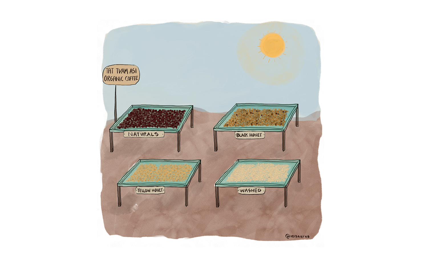 Rigorous sorting of unripe and over-ripe cherries forms the starting point. Coffee is pulped fresh and under the watch of Jaideep, whose processing expertise is on display daily thru the harvest season. Extraordinary care is given to the drying process, done under partial shade. Innovation and constant pushing of boundaries is embedded in Tat Tvam Asi’s DNA, like dreadlocks that cannot be